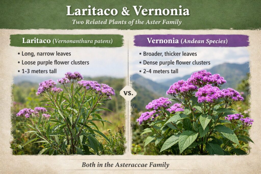 Laritaco (Vernonanthura patens) and the plants commonly called Vernonia are closely related shrubs in the Asteraceae family, which is why they often look almost identical at first glance. Both grow as woody shrubs with clusters of soft purple flowers and carry the bitter chemistry typical of many medicinal plants in this lineage. Botanically, Laritaco was once classified within the Vernonia genus before scientists reorganized the group, so the two plants share much of the same evolutionary background and many of the same phytochemical traits. The main differences appear in their physical form and habitat. Laritaco usually has longer, narrower leaves and is more common in tropical lowlands and foothills, while Vernonia species often have broader leaves and are frequently found at higher elevations in the Andes. Despite these distinctions, their similar chemistry and botanical ancestry explain why traditional herbal systems often treat them as related plants with overlapping medicinal roles.